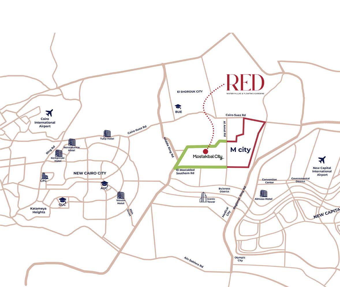 يقع كمبوند ريد | RED Mostakbal City بالقرب من الطرق الرئيسية والمحاور الرئيسية للمدينة، مما يضمن حرية التنقل بسهولة ومرونة.